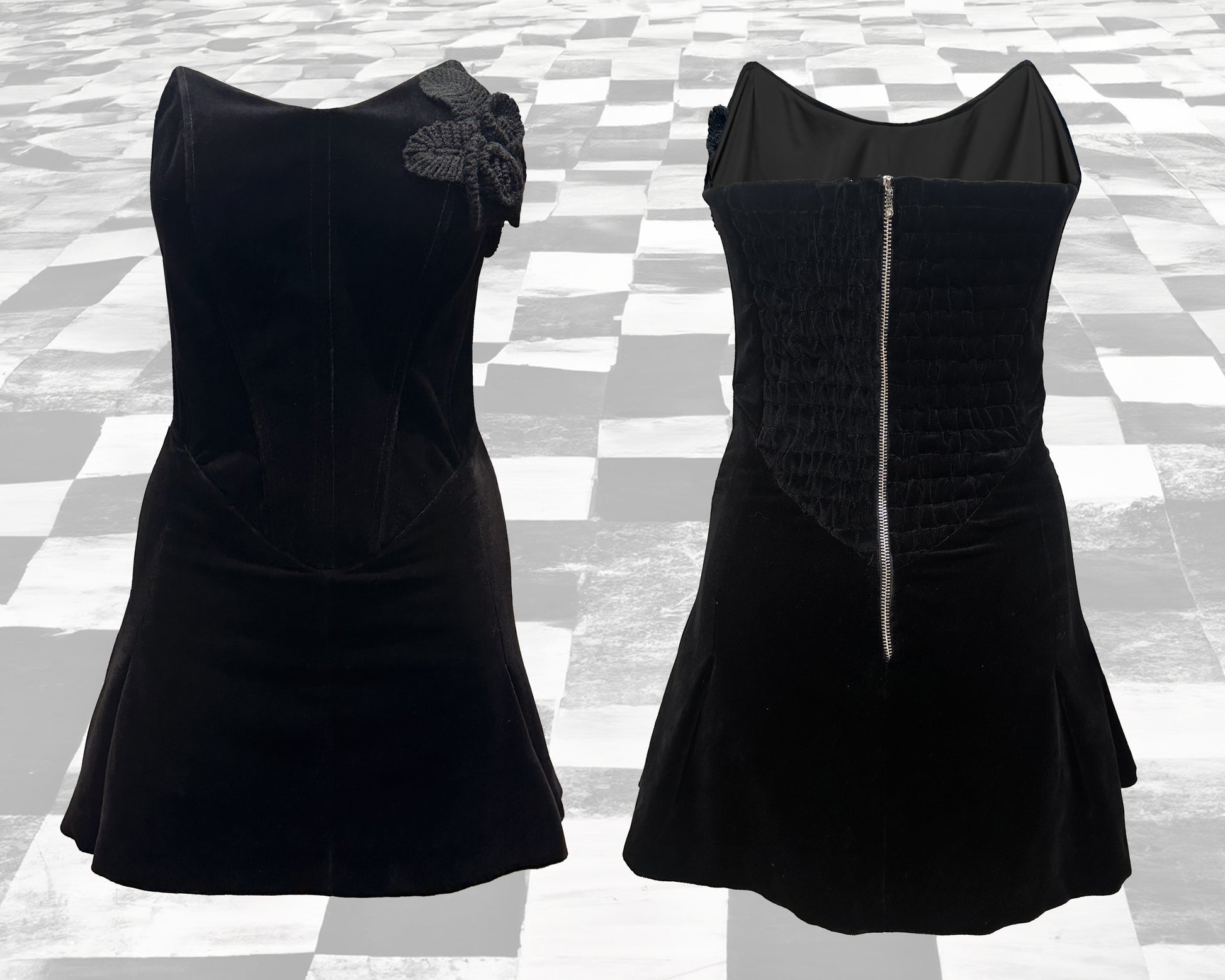 Questo elegantissimo abito in velluto liscio nero presenta un'applicazione in lana a forma di fiore con foglie sullo scollo. Può essere acquistato singolarmente o in combinazione con un delizioso bolerino in stile "vittoriano" composto da pura organza di seta ed inserti in duchesse lucida. Quest'ultimo presenta una "rouche" come collo, maniche con elastici arricciate e un fiocco sul centro davanti per chiuderlo.